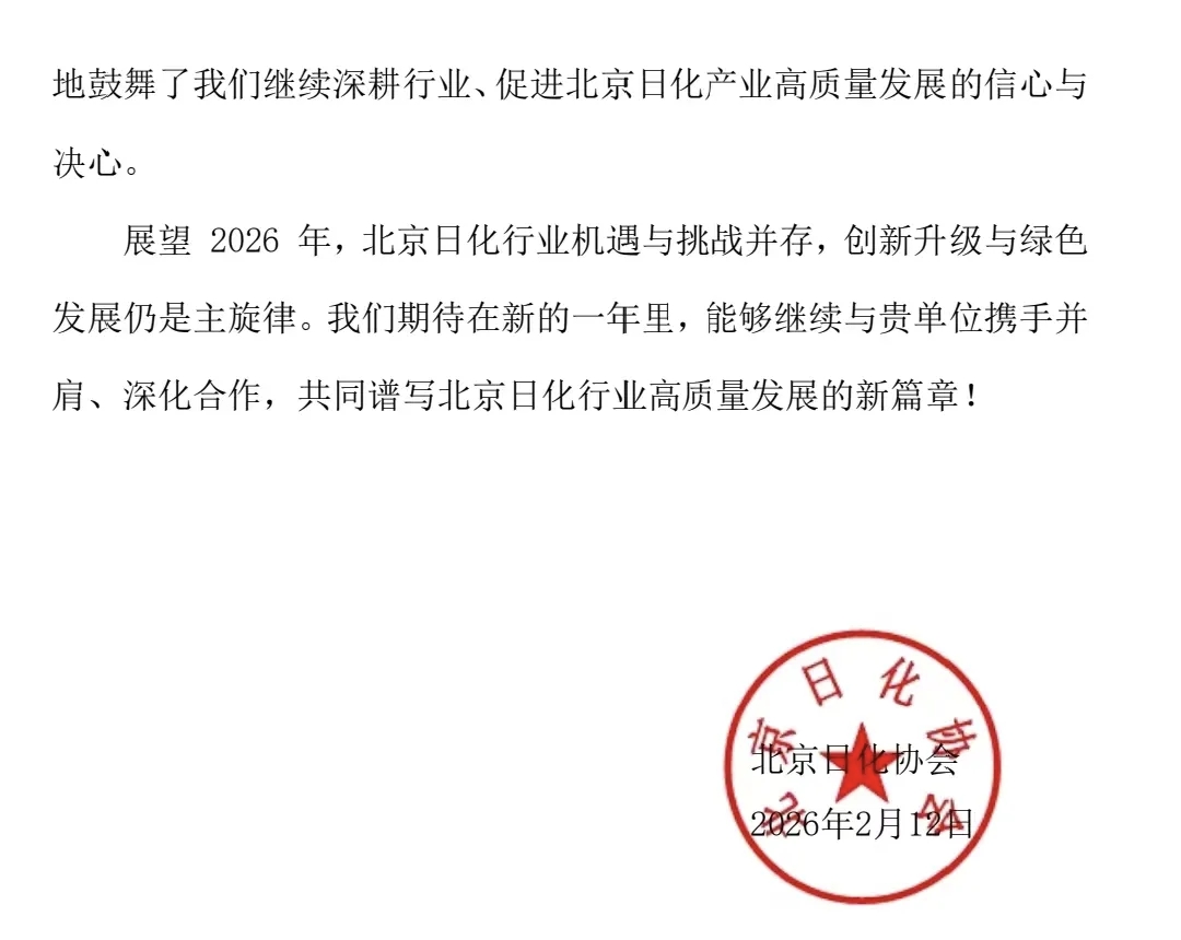 近日,北京日光旭升精细化工技术研究所(简称:北京日光公司)收到北京日化协会发来的感谢信,协会对北京日光公司在2025年为北京日化行业发展作出的积极贡献予以高度肯定,并致以诚挚感谢与新春祝福。2025年,北京日光公司积极响应协会号召,深度参与行业标准研讨、技术创新交流、质量安全科普等各项工作,主动分享实践经验、参与公益宣传,不仅普及了日化产品科学知识、引导理性消费,还聚焦行业发展热点难点问题务实探索,为搭建多方沟通桥梁、营造良好行业发展环境提供了坚实实践支撑,以锐意进取的创新精神和高度的行业责任感,成为协会推动行业发展的重要伙伴。