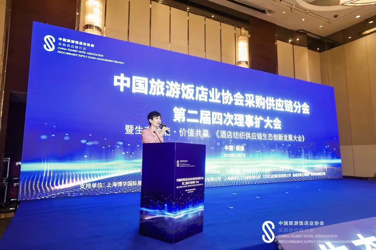 中国旅游饭店业协会副秘书长张维先生致辞,他表示:本届大会以 “生态赋能,价值共赢” 为主题,旨在汇聚产业链上下游的智慧与力量,共同探索酒店纺织领域协同创新、降本增效与绿色发展的新路径。这不仅是应对当前挑战的必然选择,更是驱动行业未来高质量发展的关键引擎。希望各位同仁能充分利用这一平台,深入交流,凝聚共识,共同推动酒店纺织供应链向更高效、更可持续的未来迈进。