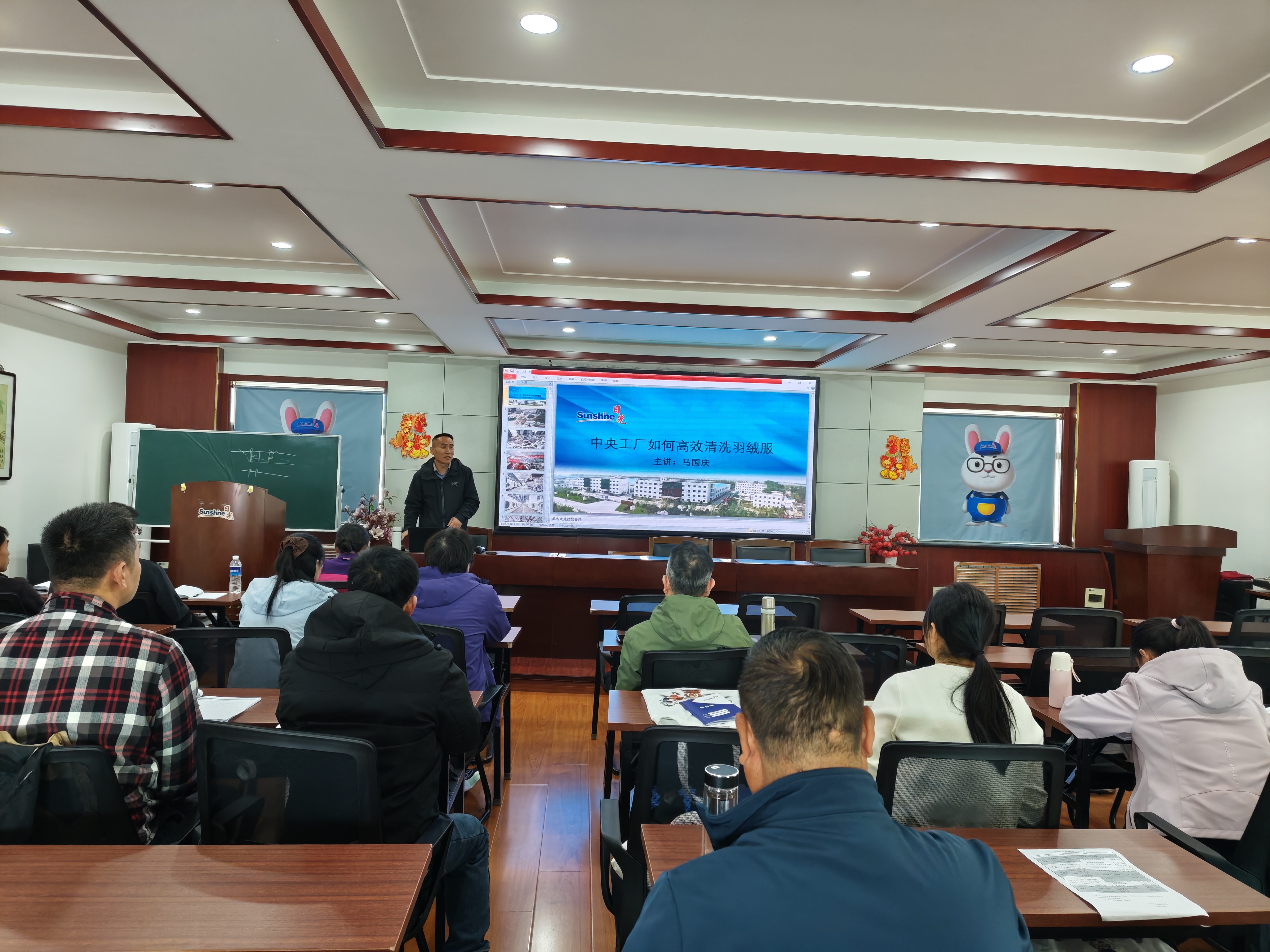 马国庆向学员讲解了中央工厂洗涤技术与水洗机编程相关知识,内容包括中央工厂洗涤工作流程与操作规范,如洗涤前准备、水洗步骤、烘干注意事项等,还介绍了如何参照标准洗涤工艺优化洗涤程序编程,涉及水洗机编程的具体步骤和参数设置等内容。